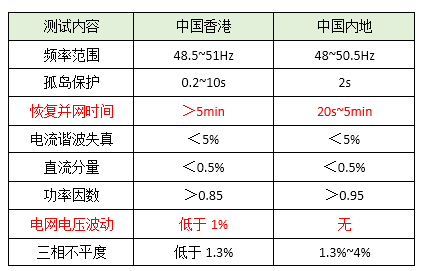 Á½µã±È½Ï´óµÄ²îÒ죬һ¸öÊDz¢Íø»Ö¸´Ê±¼äÒªÇó£¬Ïã¸ÛÒªÇó¸ü³¤£»Ò»¸öÊÇÏã¸ÛµØÇøÒªÇóµçѹ²¨¶¯²»³¬¹ý1%£¬¶øÄÚµØÔòûÓÐÕâ¸öÒªÇó¡£