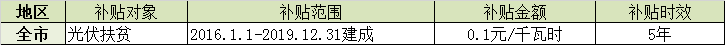 ²¹Ìù¶ÔÏóºÍ½ð¶î£º¶Ô2016Äê1ÔÂ1ÈÕÖÁ2019Äê12ÔÂ31ÈÕÆÚ¼ä½¨³ÉµÄ¹â·ü·öƶÏîĿʵÐеç¼Û²¹Ìù¡£¸øÓèÿǧÍßʱ0.1Ôª²¹Ìù£¬²¹Ìùʱ¼äΪ5Äê¡£