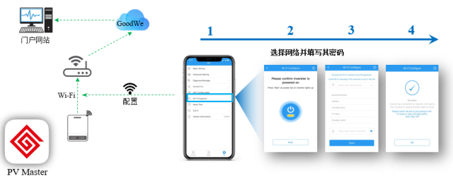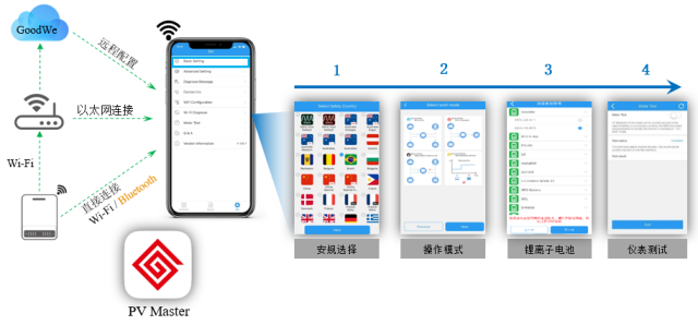 É豸°²×°½ÓÏßÍê±ÏÖ®ºóÉ豸µÄͨÐÅָʾµÆ´¦ÓÚÉÁ˸״̬£¬ÐèÒª¶ÔÉ豸½øÐÐÅäÖ㬲ſÉÒÔÕý³£ÔËÐУ¬Ê×ÏÈÐèÔÚÓ¦ÓÃÉ̵êÏÂÔØPV Master Ó¦ÓóÌÐò£¬ÔÚÊÖ»úÉèÖÃÖÐÁ¬½Ó´¢ÄÜ»ú·¢³öµÄWI-FI£»