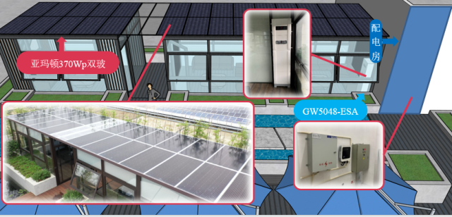 ÏîĿѡÓÃһ̨´¢ÄÜÒ»Ìå»úESA £¨5kW+10kwh£©ºÍһ̨µ¥Ïà²¢ÍøÄæ±äÆ÷DSS£¬ÐͺŷֱðΪGW5048-ESAºÍGW5000D-SS£»ESAºÍDSS·Ö±ð½ÓÈë14¿é×é¼þ£¬ÈÝÁ¿¾ùΪ5.18kWp£»´¢ÄÜÒ»Ìå»ú·ÅÔÚÑô¹â·¿ÖÐ×öSEMS Homeչʾ£¬DSSºÍ²¢Íø»ãÁ÷Ï伯ÖзÅÖÃÔÚÂ¥¶¥ÅäµçÊÒÖС£