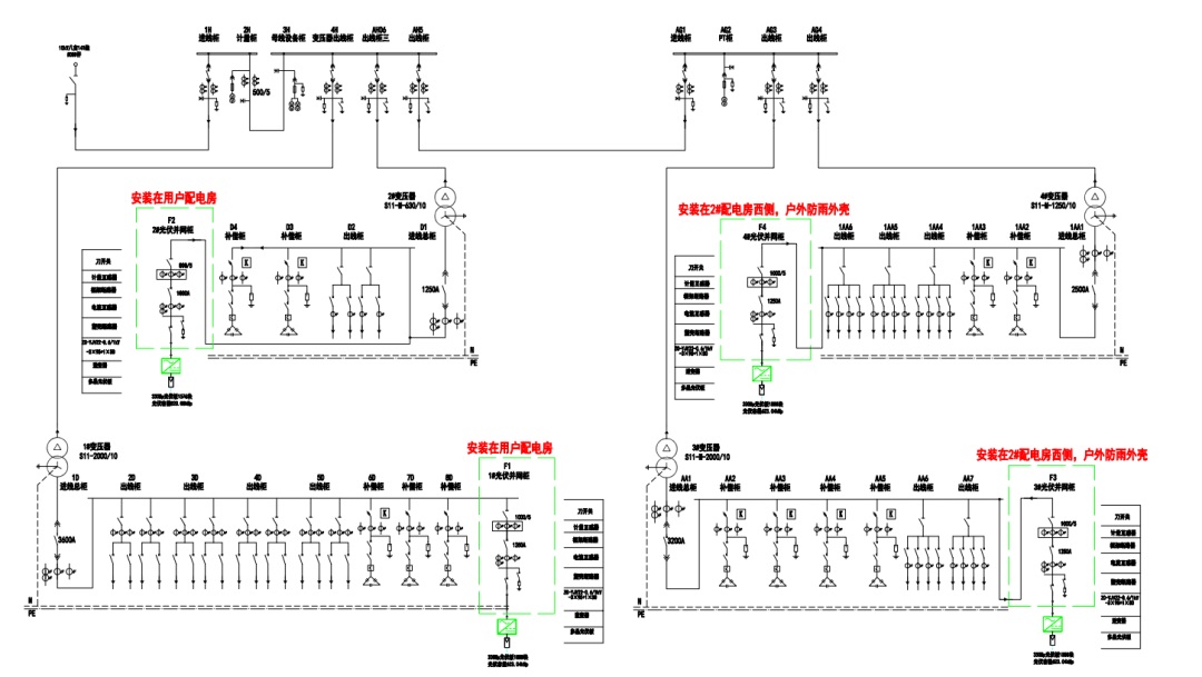 2ºÅÅäµç·¿ÊÇ·ÖÅäµç·¿£¬ÅäÖÃÁ½Ì¨±äѹÆ÷£¬±äѹÆ÷ÈÝÁ¿ÊÇ£º2000KVA£¨3#±äѹÆ÷£©+1250KVA£¨4#±äѹÆ÷£©¡£3#²¢Íø¹ñ£¨F3£©½ÓÈë3#±äѹÆ÷µÍѹ²à£¬¸Ã²¢Íø¹ñÅäÖÃ4̨GW120K-HTÄæ±äÆ÷£¬×ܹ¦ÂÊΪ480KW£»4#²¢Íø¹ñ£¨F4£©½ÓÈë4#±äѹÆ÷µÍѹ²à£¬¸Ã²¢Íø¹ñÅäÖÃ4̨GW120K-HTµÄÄæ±äÆ÷£¬×ܹ¦ÂÊΪ480KW¡£