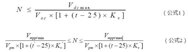 ÉÏÊö¹«Ê½ÖÐVdcmaxÎªÄæ±äÆ÷ÊäÈë×î´óÖ±Á÷µçѹ£¬Vmpptmin¡¢Vmpptmax·Ö±ðÎªÄæ±äÆ÷×îС¹¤×÷µçѹºÍ×î´ó¹¤×÷µçѹ¡£ÆäÒªÇó¿¼ÂÇζÈϵÊýµÄ×é´®¿ªÂ·µçѹҪСÓÚÄæ±äÆ÷×î´óÊäÈëµçѹ£¬¿¼ÂÇζÈϵÊýµÄ×é´®MPPTµçѹҪÔÚÄæ±äÆ÷MPPT¸ú×Ù·¶Î§Ö®ÄÚ¡£